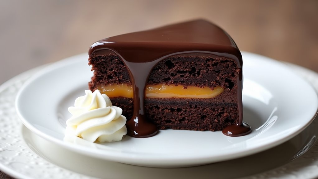 When slicing, use a warm knife to achieve clean cuts through the rich chocolate layers, guaranteeing each piece looks as good as it tastes.