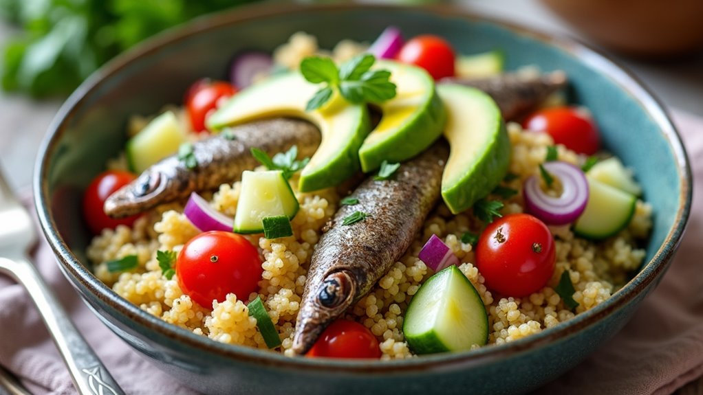- Assemble the Bowl: Once the quinoa is cooked, fluff it with a fork and add it to the mixing bowl with the vegetables. Gently fold in the flaked sardines, being cautious not to mash them. Adjust seasoning if needed.