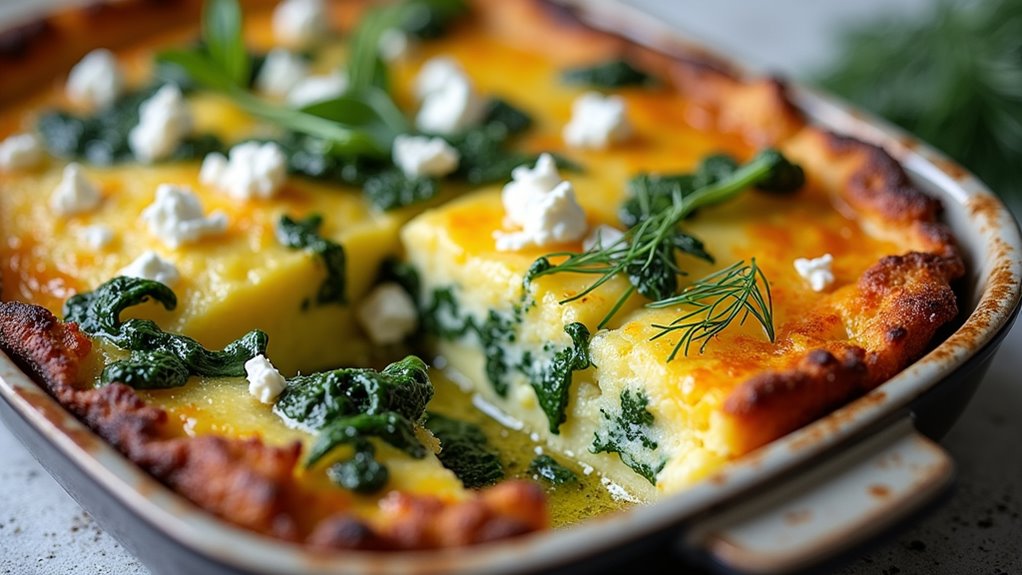 If making this dish ahead of time, assemble the ingredients without baking and store in the refrigerator. Bake it fresh in the morning for a warm and comforting breakfast option. Enjoy your Herb-Infused Egg Bake With Spinach and Feta!