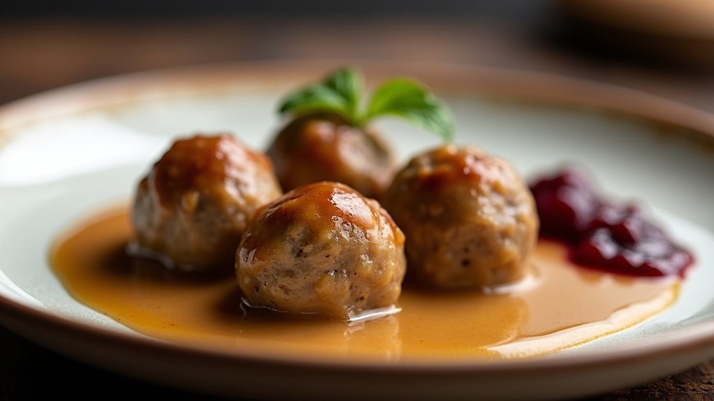 Serve the meatballs hot, drizzled with the creamy gravy, accompanied by lingonberry sauce on the side.